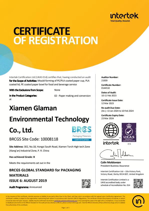 Pour les acheteurs internationaux, trouver des emballages sûrs et fiables peut s'avérer complexe. C'est là que… BRC (Normes mondiales de conformité en matière de réputation de marque) La certification intervient. En tant que fabricant leader de contenants alimentaires jetables en papier biodégradable La société Xiamen Glaman Environmental Technology Co., Ltd. a construit son atelier de production selon les normes BRC les plus strictes.